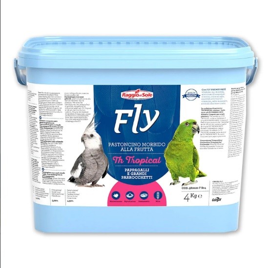 Raggio di Sole'nin Fly Paté serisinden TH Tropical Fruitti Paté, üreme dönemindeki muhabbet kuşları, papağanlar, kanaryalar, kakadular ve paraketler için meyve bazlı yumuşak bir mamadır.