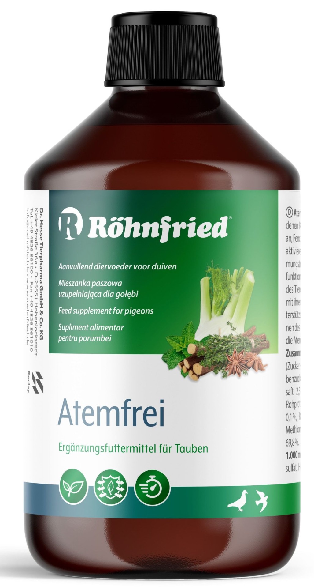 Röhnfried Atemfrei, doğal özel iksir kuşlar için meyan kökü, kekik, rezene, anason ve nane gibi çeşitli bitkisel yağların spesifik bir iksiridir. Bu bitkisel yağlar solunum yollarındaki metabolizmayı harekete geçirir, bağışıklık sistemini destekler ve böylece kuşlarınızın canlılığını artırır. Baharatlı aromaları ve eklenen C vitamini ve çinko ile yüksek kaliteli bitkisel yağlar solunum yollarının fizyolojik fonksiyonlarını destekler.
