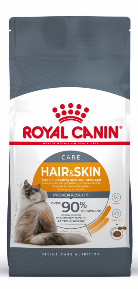 ROYAL CANIN® Hair & Skin Care, kedinizin deri ve tüy sağlığını desteklemek için özel olarak tasarlanmış, besin ögesi açısından eksiksiz ve dengeli bir formüldür. Bu formül, kedinizin derisini ve tüylerini içten dışa doğru desteklemeye ve beslemeye yardımcı olmak için GLA, EPA ve DHA dahil olmak üzere omega-3 ve omega-6 yağ asitleri içerir. Bu formüldeki vitaminlerin sinerjik karışımı, kedinizin derisinin onu çevreye karşı koruyan bariyer rolünü desteklemeye yardımcı olur. ROYAL CANIN® Hair & Skin Care, kanıtlanmış sonuçlara sahiptir. Çalışmamız* kedi sahiplerinin %90'ından fazlasının, kedilerini bu mama ile besledikten sadece 3 hafta sonra iyi bir deri ve tüy kalitesi gözlemlediklerini gösterdi.ROYAL CANIN® Hair & Skin Care ayrıca 2 farklı yaş mama olarak da mevcuttur: sos ve jöle. Hem yaş mama hem de kuru mamanın karışımı, kedilerin sevdiği çeşitliliği sağlar.*Royal Canin şirket içi çalışması