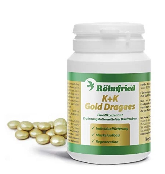 Röhfried K+K Gold Dragees Altın Kaplamalı Hayvansal Protein Hapları özellikle güvercinlerin yüksek protein ihtiyacı duydukları fiziki yorgunluklardan sonra çözüm olarak kullanılır. İçerisinde bulunan zengin balık yağı,peynir altı suyu proteini yanı sıra metiyonin, lesitin ve magnezyumdan elde edilen kolayca sindirilebilir hayvan protein içerir. Balık proteini genellikle örneğin domuz plazma proteininden daha iyi bir omega-3 bileşimine sahiptir. Peynir altı suyu, özellikle yüksek bir biyolojik değer gösterir.K + K Altın kaplı tabletler, güvercinlerin uçuştan sonra yüksek kaliteli, kolayca sindirilebilir protein ile beslenmesini sağlamak ve böylece hızlı yenilenmeyi sağlamak için tasarlanmıştır. Optimize edilmiş amino asit bileşimi nedeniyle, tablet metabolizmayı neredeyse hiç etkilemez ve geri dönenlerin veya ağır şekilde uçan güvercinlerin bireysel bakımı için idealdir.